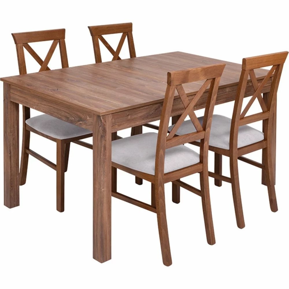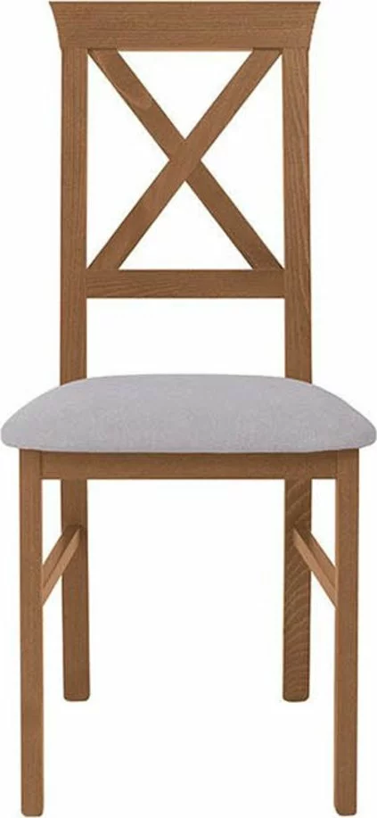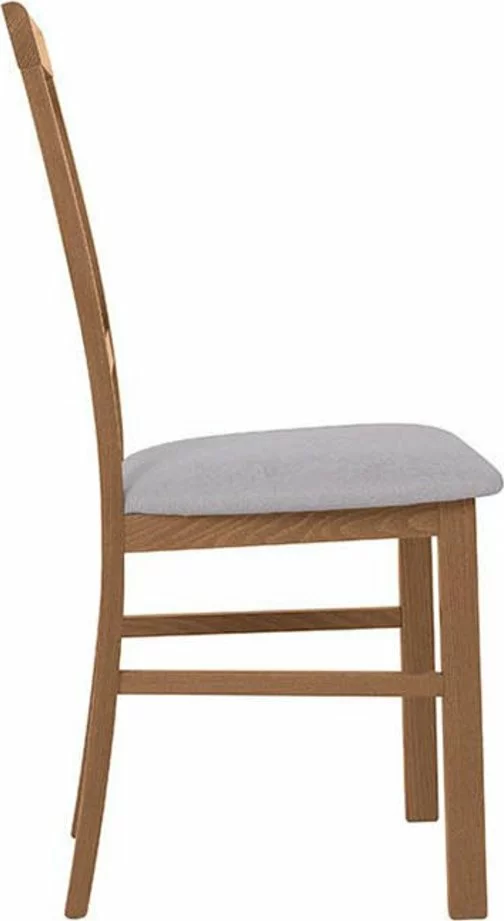 Puinen ruokapöydän tuoli kangasverhoilulla.