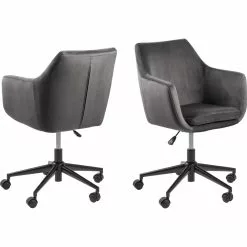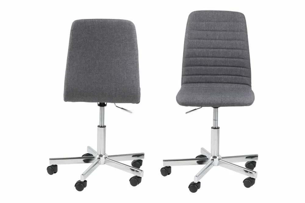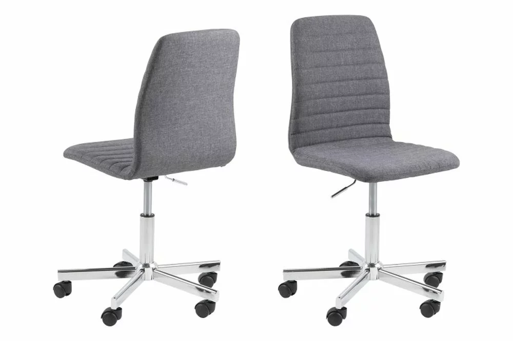 Tyylikäs ja mukava työtuoli päällystetty harmaalla kankaalla. Istuinta voi nostaa ja laskea. kromi tähtijalusta pyörillä.