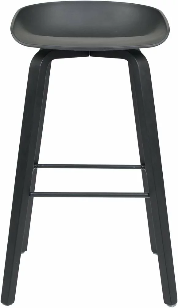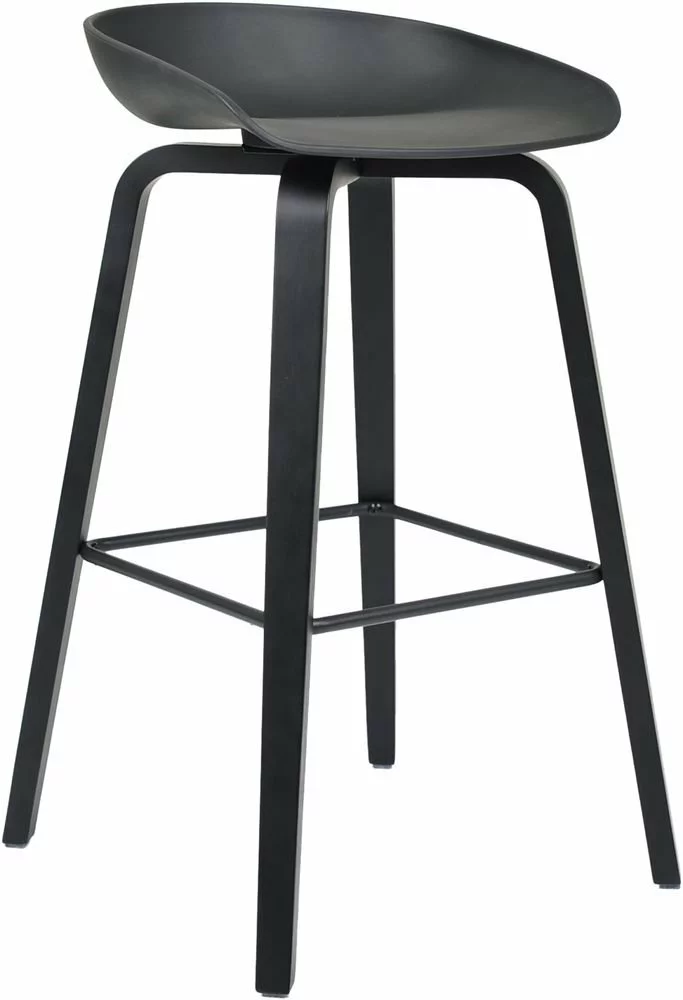 Röyhkeä musta baarijakkara jalkatuella. Tyylikäs ja sopii moneen ympäristöön.