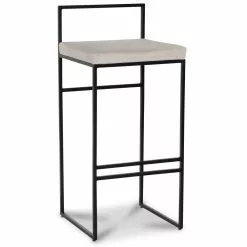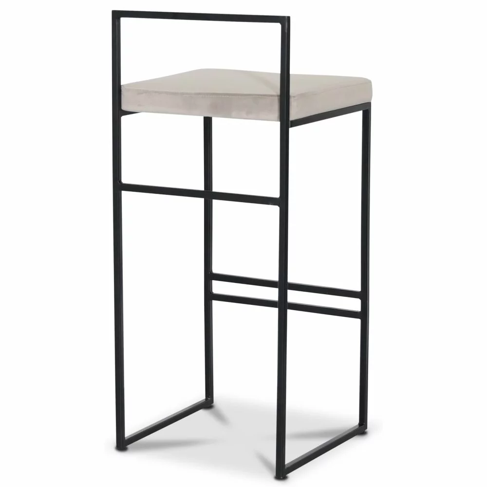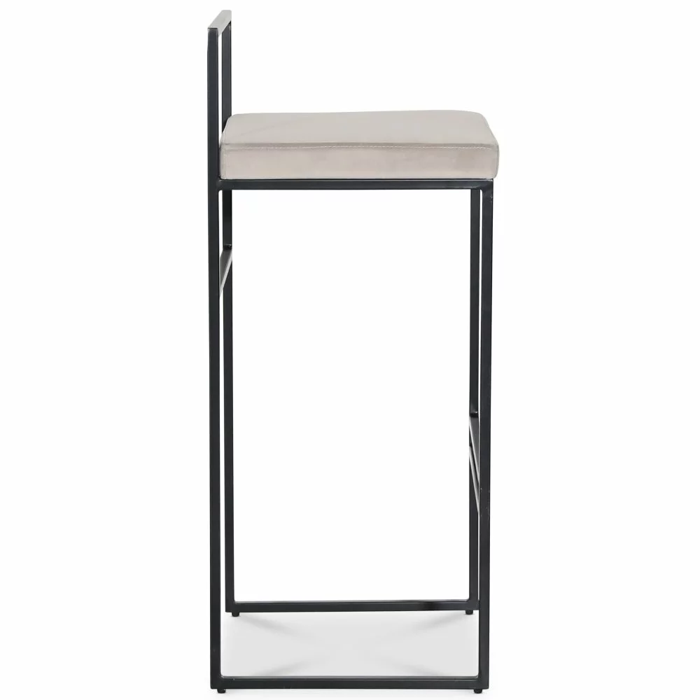 Tyylikäs ja moderni baarijakkara, jossa istuin ja tyyny harmaabeigestä samettikankaasta. Musta pulverimaalatut jalat.