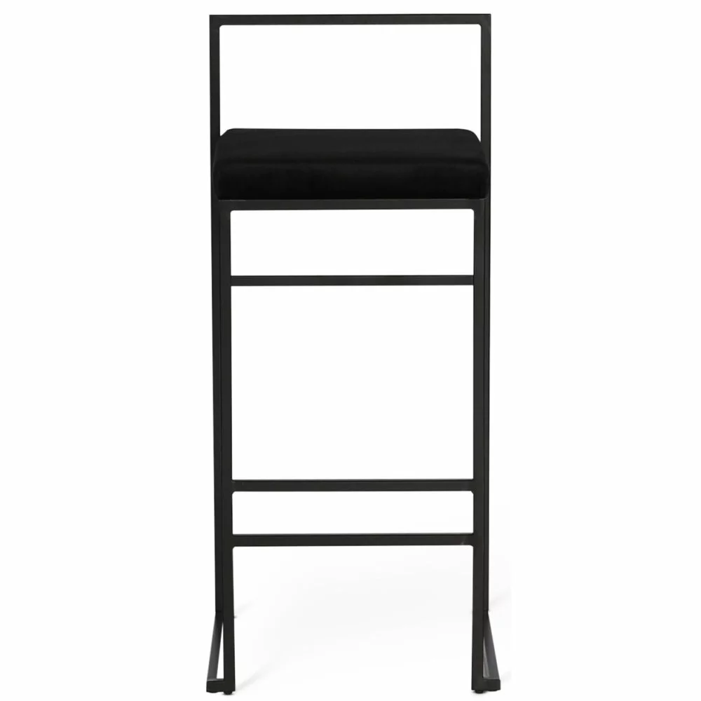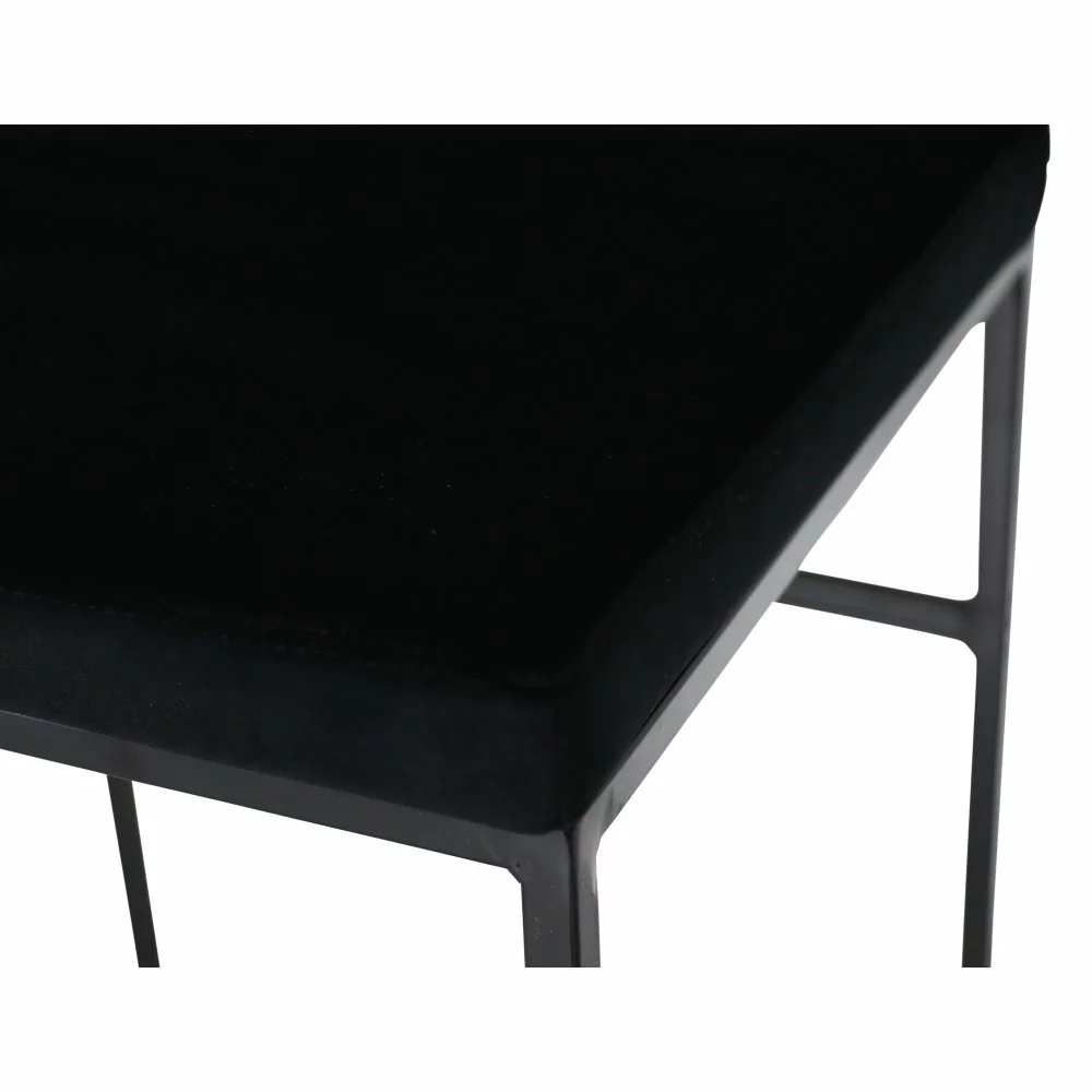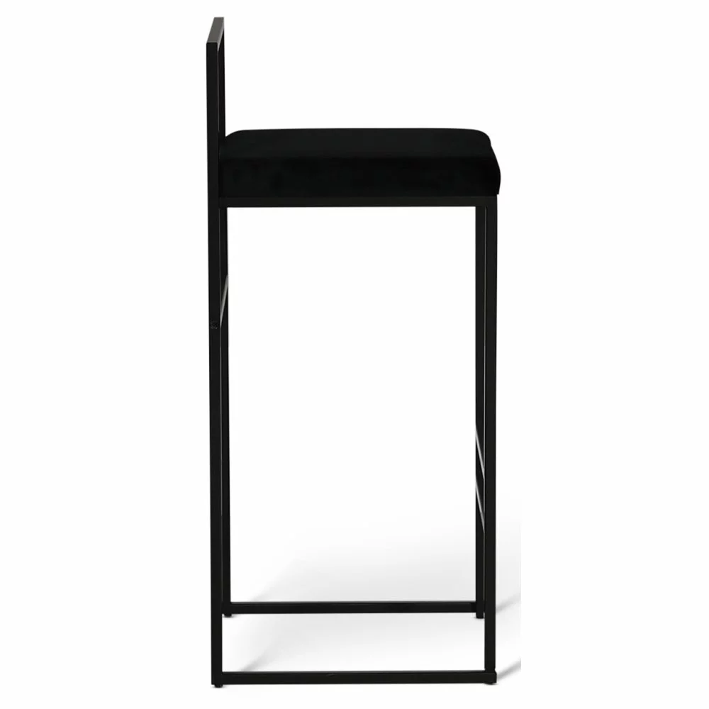 Tyylikäs ja moderni baarijakkara, jossa istuin ja tyyny mustaa samettia. Musta pulverimaalatut jalat.