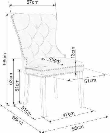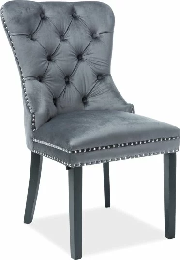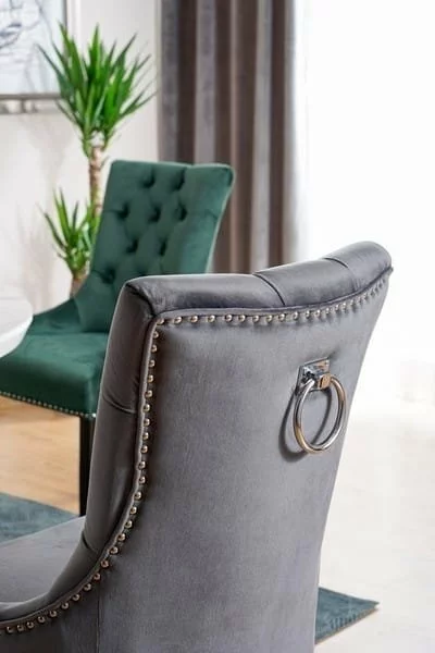 Metallinen ruokapöydän tuoli. Päällystetty polyesterillä jäljitelmässä samettia. Takana metallirengas.