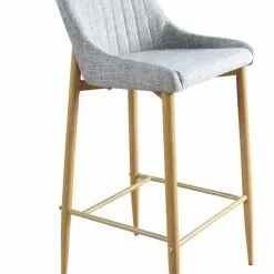 Moderni harmaanbeigellä kankaalla verhoiltu baarituoli, 100 % polyesteriä ja metallirunko pyökkikuviolla.