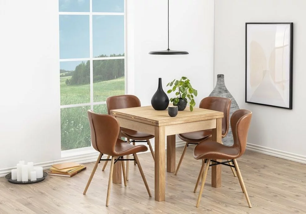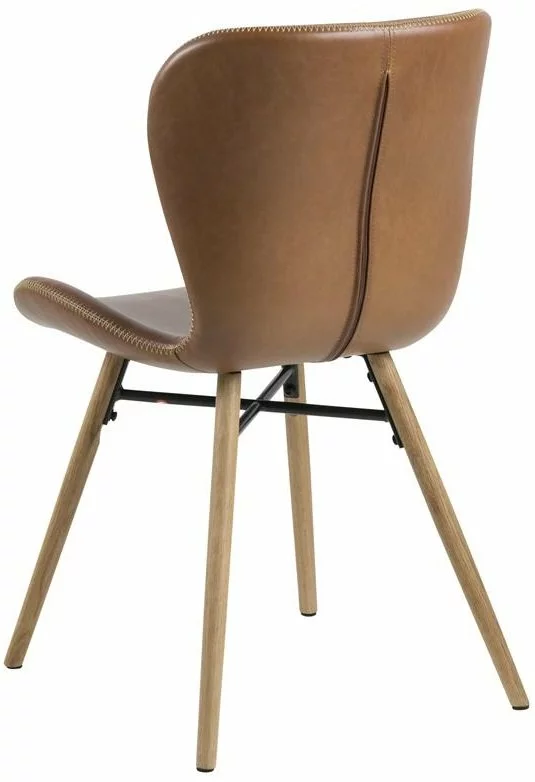 Mukava ruokatuoli, ruskeaa keinonahkaa ja öljytyt massiivitammea jalat. Täydellinen useille eri pöydille.