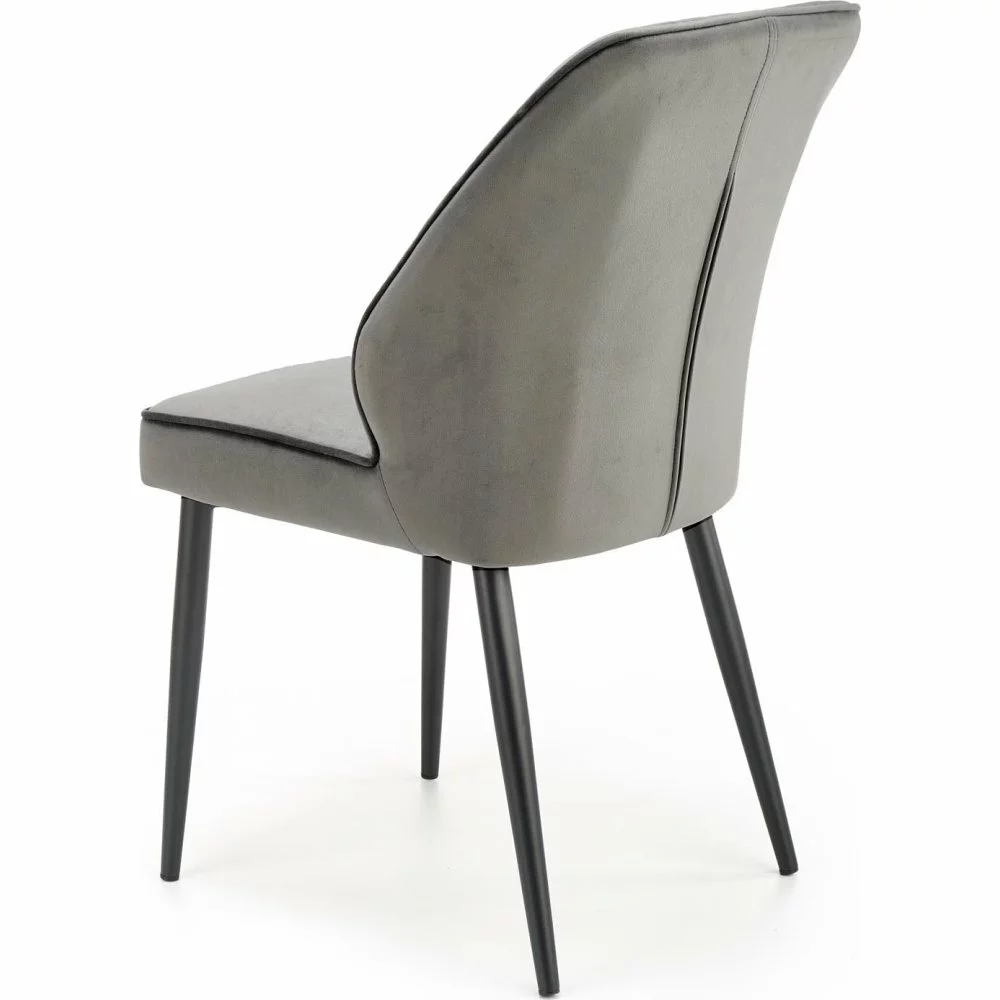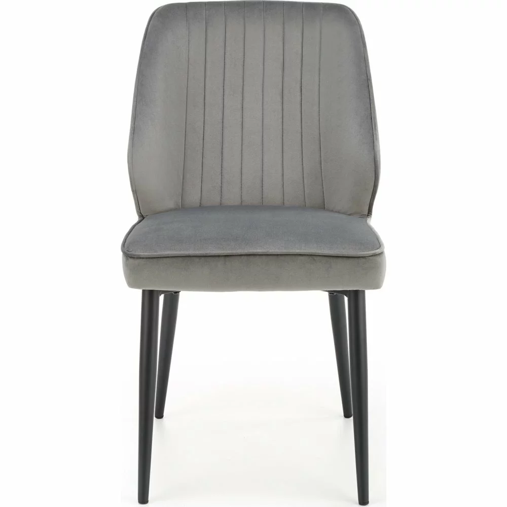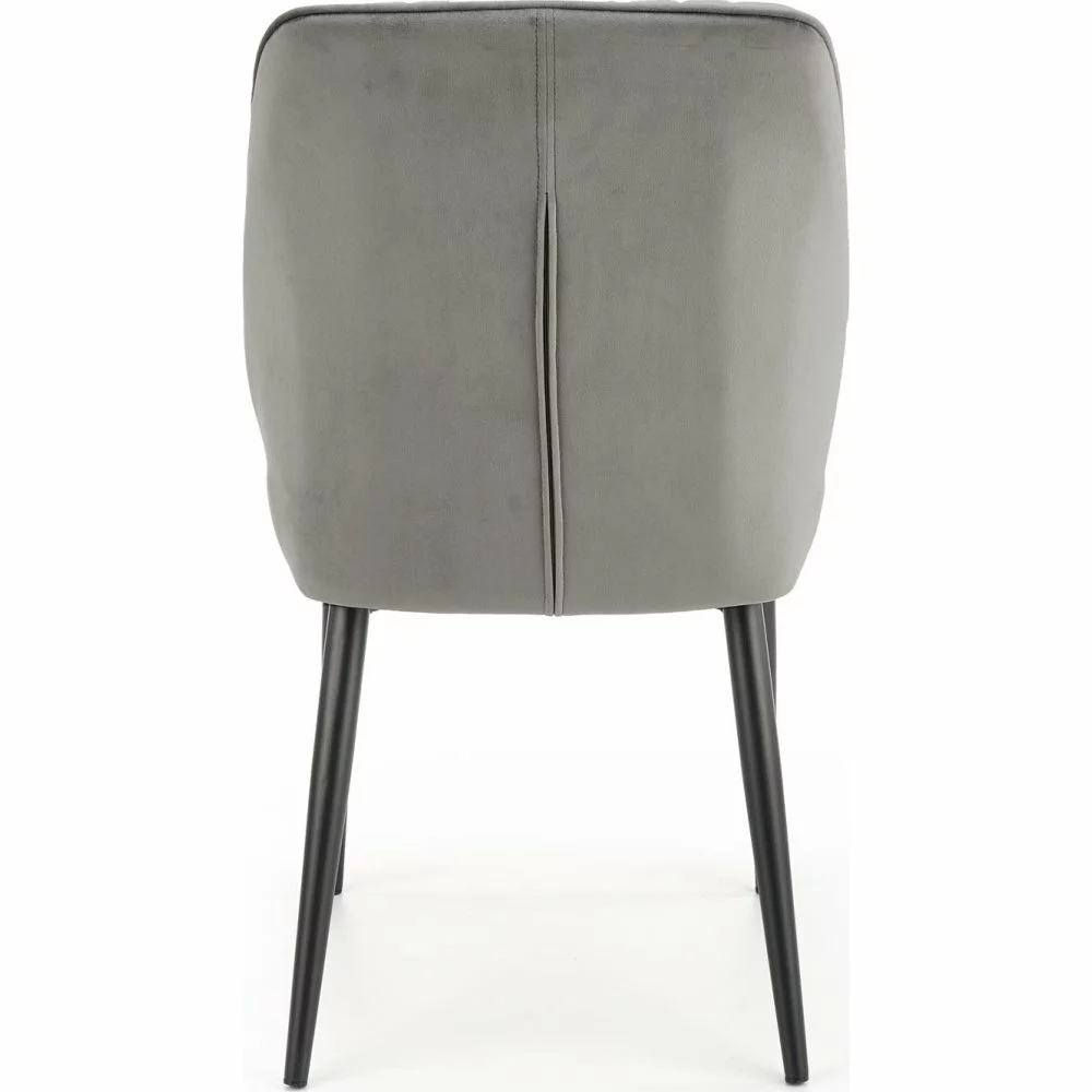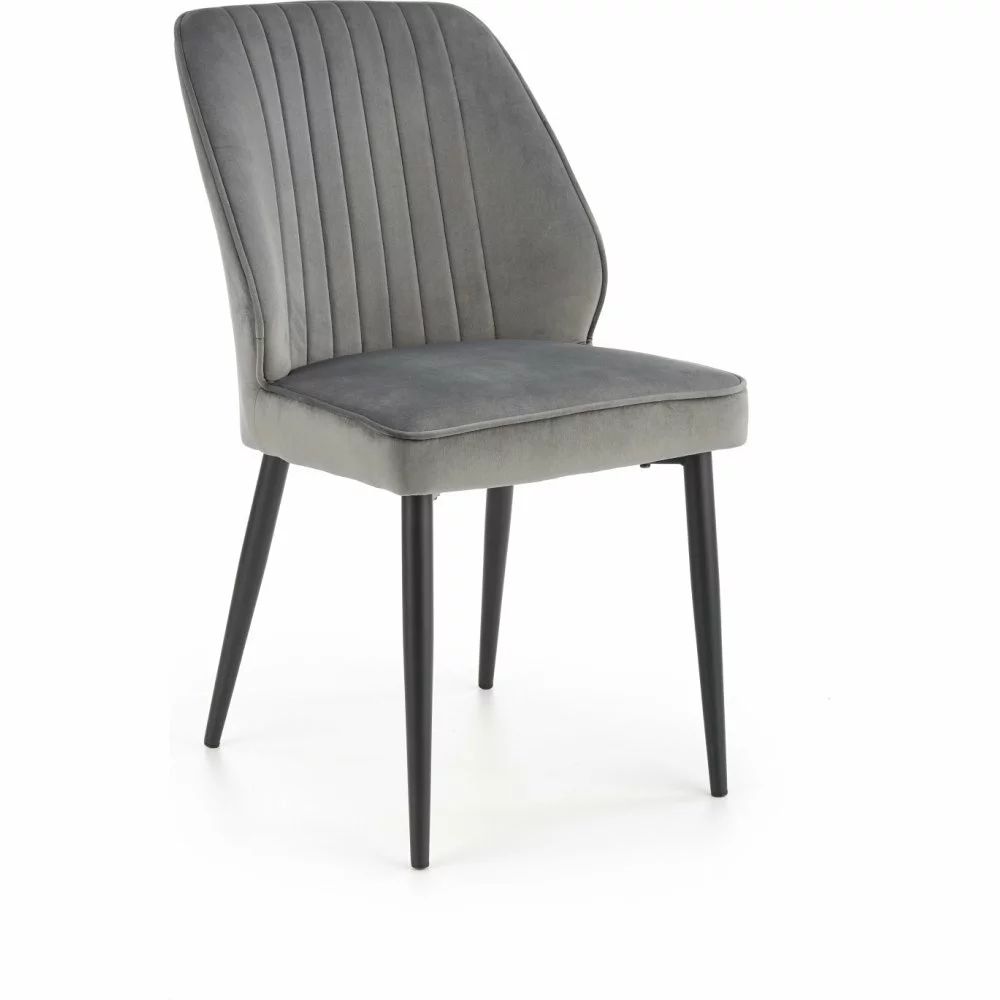 Teräksinen ruokatuoli samettiverhoilulla.