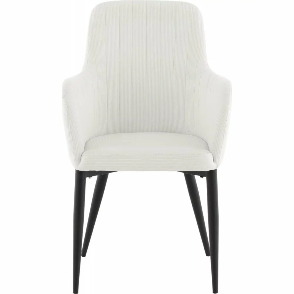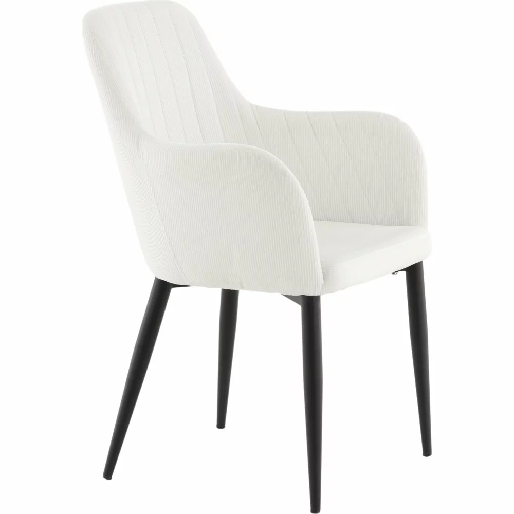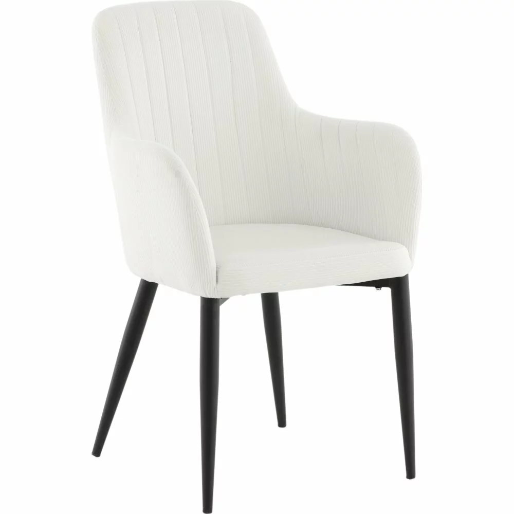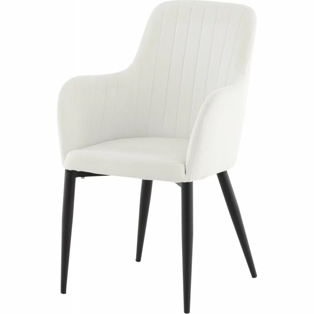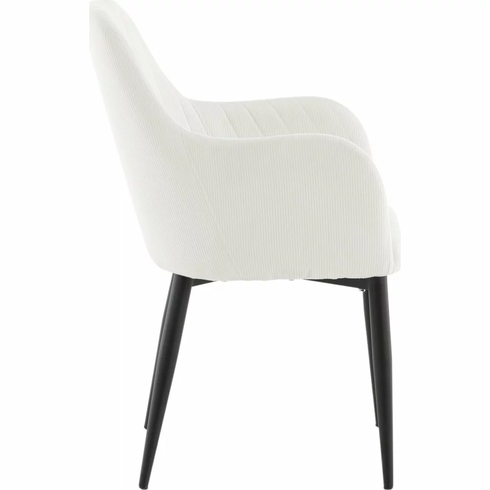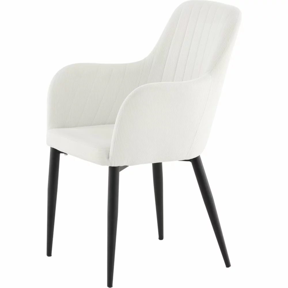 Tällä trendikkäällä vakosamettituolilla moderni design kohtaa 50-luvun nostalgiaa. Pukeutunut pehmeään, kevyeen samettikankaaseen, joka luo kodin sydämeen ihanaa kiiltoa ja modernia ilmettä. Jalat ovat mustaa jauhemaalattua metallia ja istuin integroiduilla käsinojilla beige vakosamettikankaalla tarjoaa mukavan istumamukavuuden. Koristeelliset saumat selkänojan sisäpuolella ja käsinojassa ovat tyylikäs yksityiskohta.