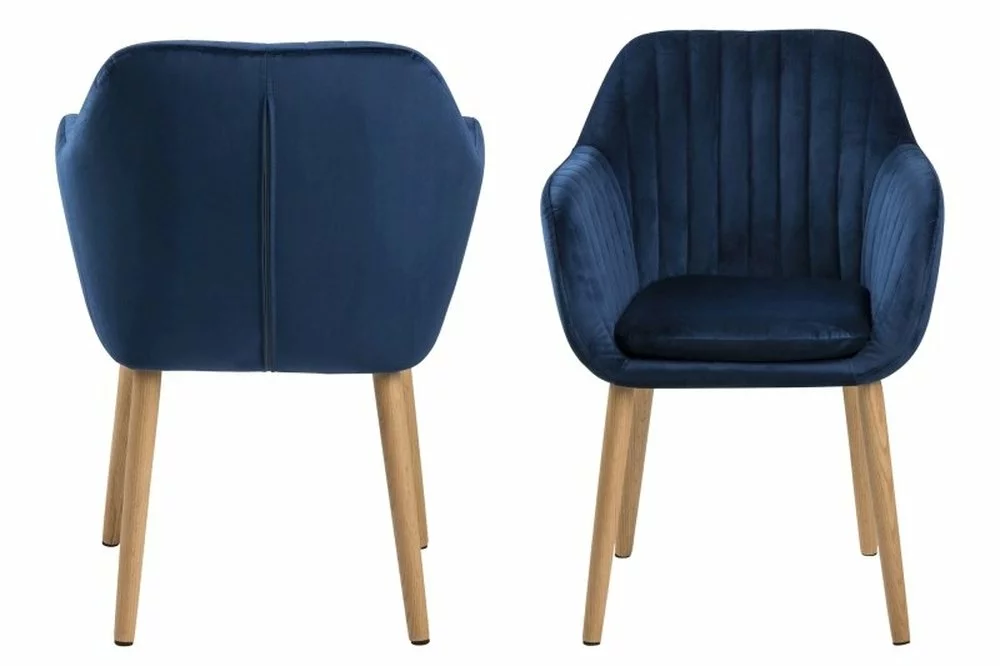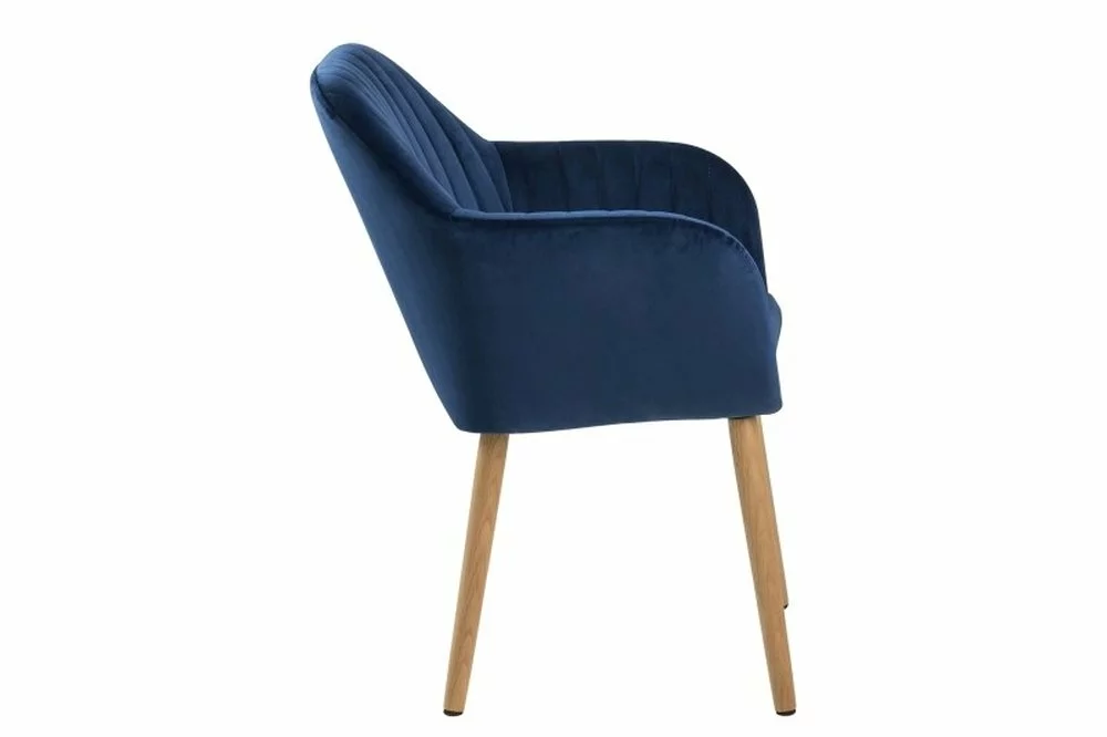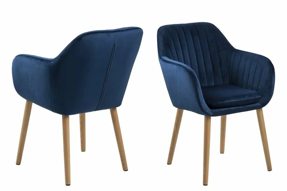 Klassisella profiililla varustettu nojatuoli. Pukeutunut tummansiniseen samettikankaaseen ja jalat öljytystä tammesta. Tuoli on osa Emilia-sarjaamme.