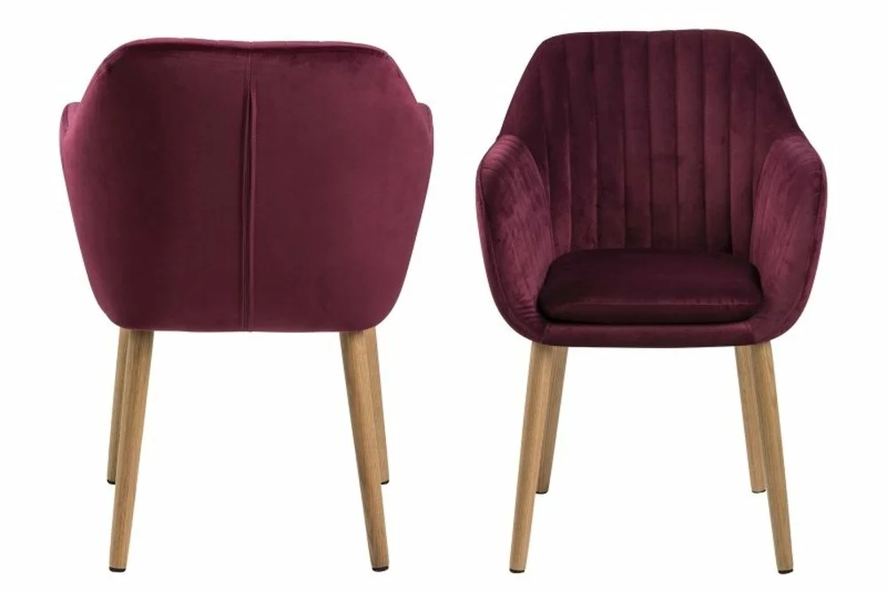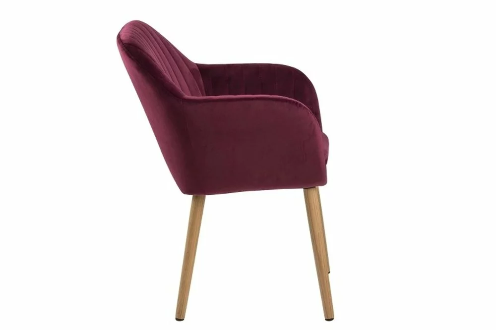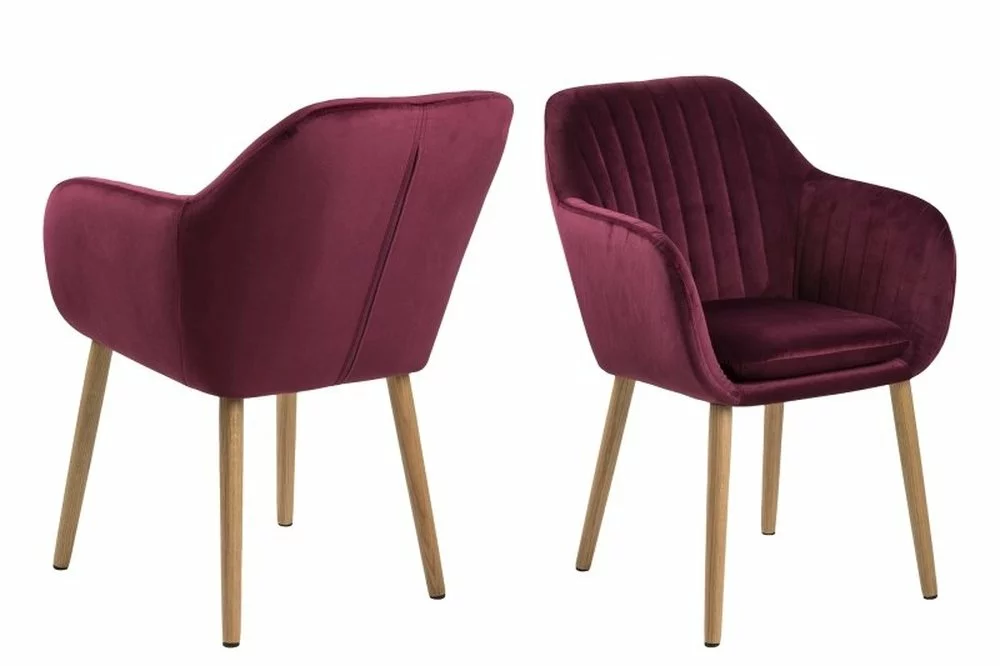 Klassisella profiililla varustettu nojatuoli. Verhoiltu viininpunaisella samettikankaalla ja jalat öljytystä tammesta. Tuoli on osa Emilia-sarjaamme.