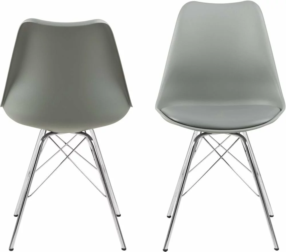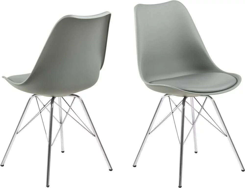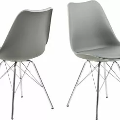 Ruokatuoli kromatulla rungolla. Istuin on valmistettu harmaasta muovista ja istuintyyny on verhoiltu harmaalla keinonahkalla lopullisen mukavuuden takaamiseksi.