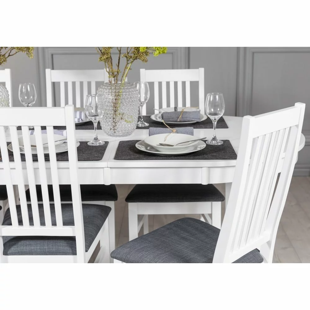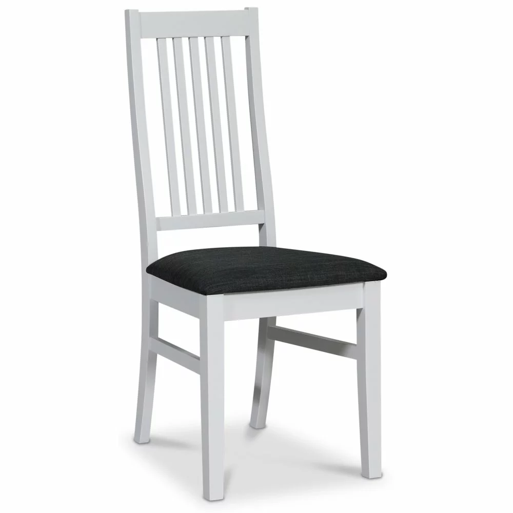 Klassinen tuoli valkoiseksi lakattua massiivipuuta, istuin päällystetty kestävällä harmaalla kankaalla.