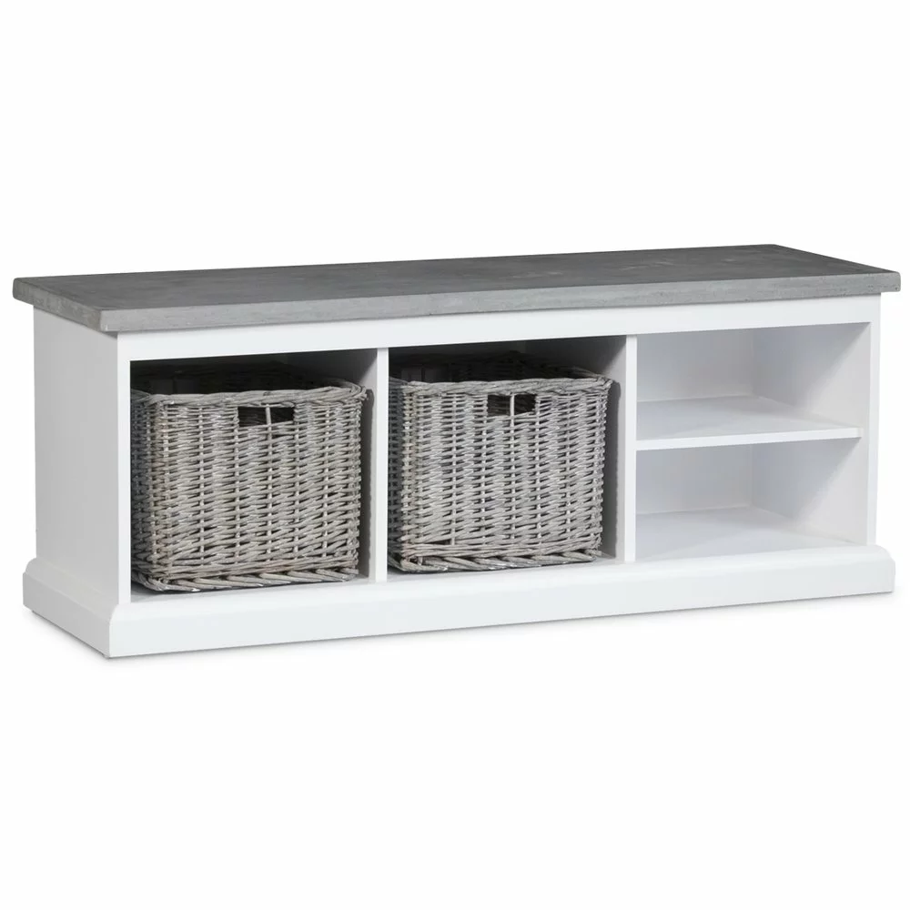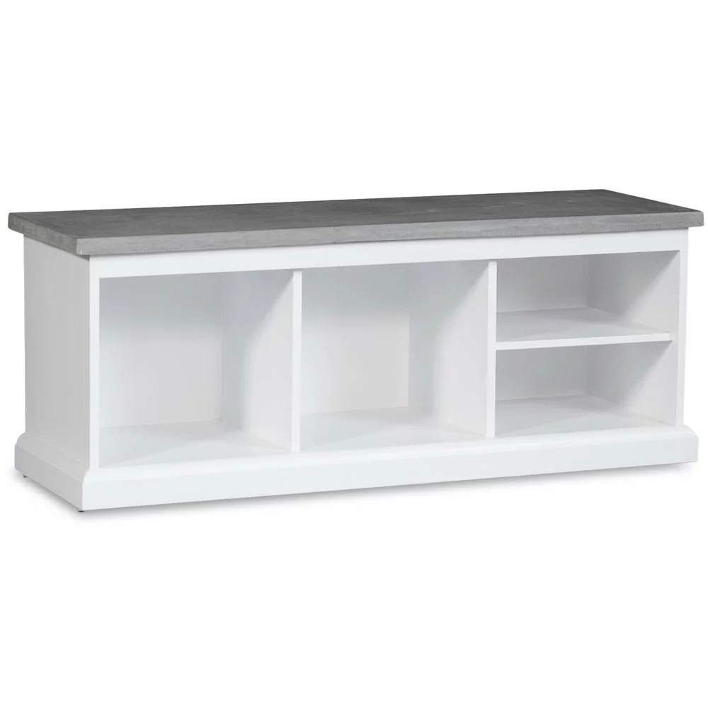 Valkoinen puupenkki. Ylälevy on valmistettu sementistä, mikä tekee siitä erityisen kestävän. Kaksi isompaa säilytystilaa ja kaksi kapeampaa säilytystilaa. Osta lisäksi Hugo-säilytyskoreja.