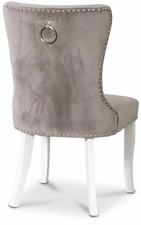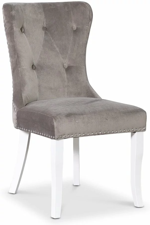 Tuoli täysin verhoiltu tyylikkääseen harmaaseen samettiin. Mukava ja kestävä tuoli, joka antaa vankan vaikutelman ja sopii moniin erilaisiin ruokapöytiin. Valkoiset lakatut puiset jalat ja selän takaosassa krominen kahvarengas, joka sopii tuolin kromi-niitteihin. Taivutettu selkä tarjoaa hyvän istumamukavuuden.