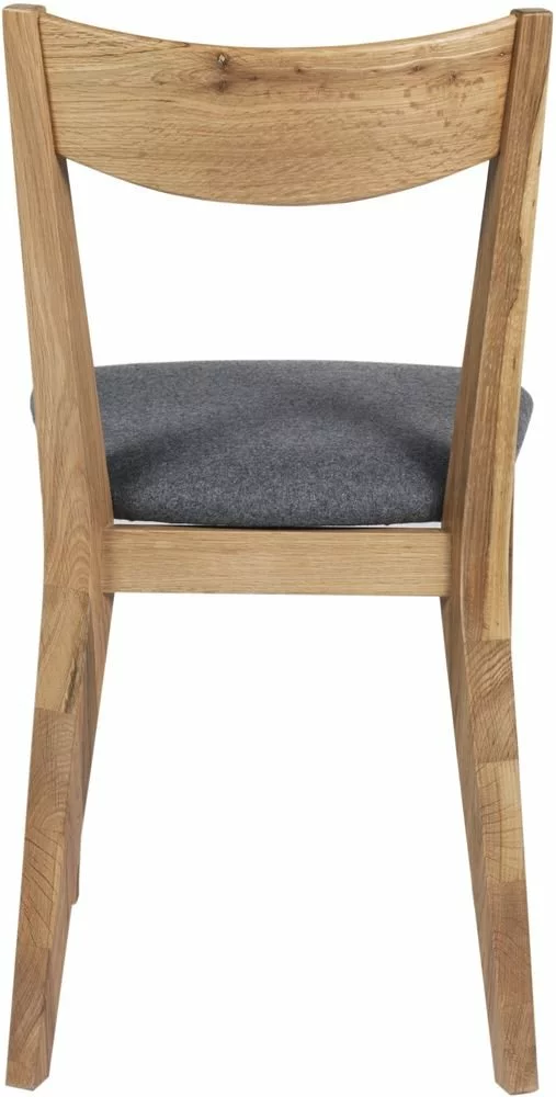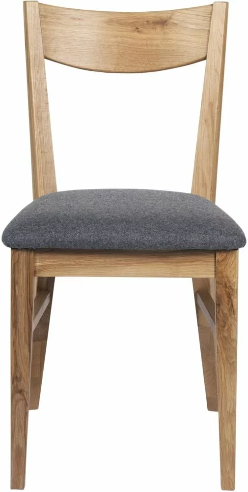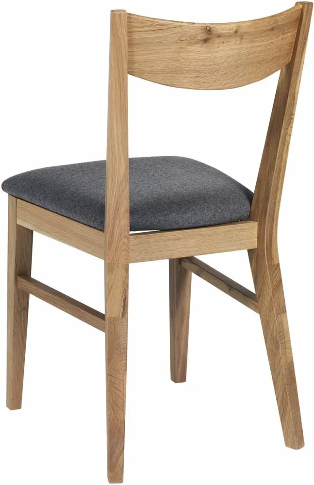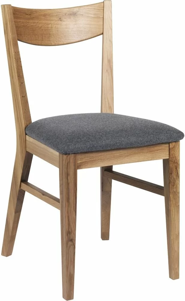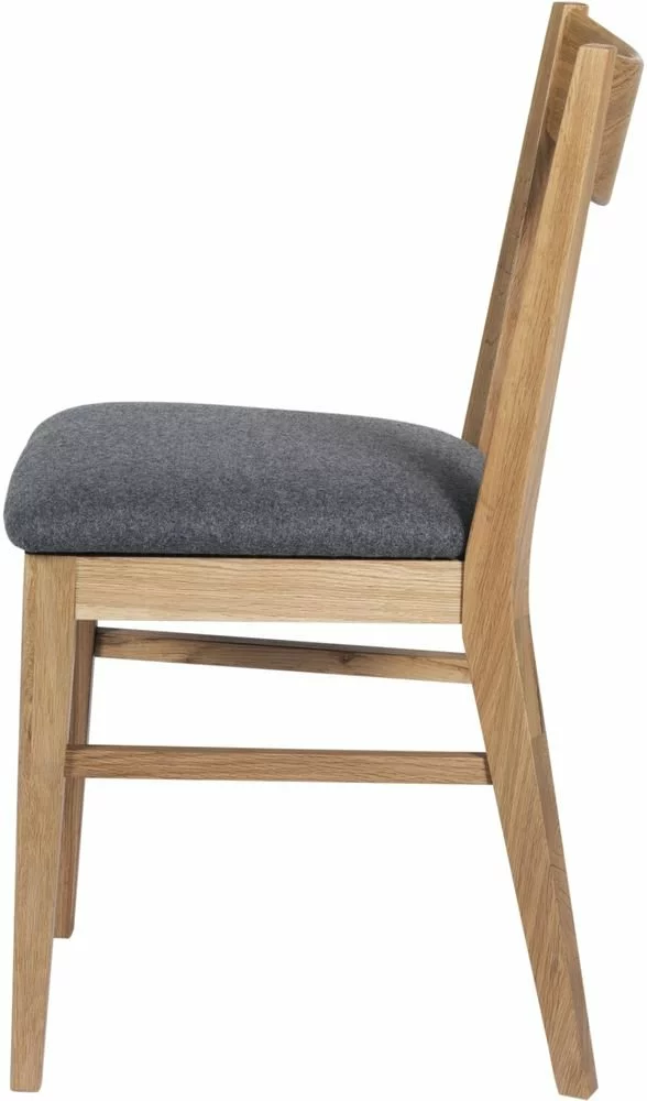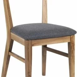Skånska Möbelhusetin tuoli lakatusta massiivitammesta, istuin on verhoiltu harmaalla kankaalla.