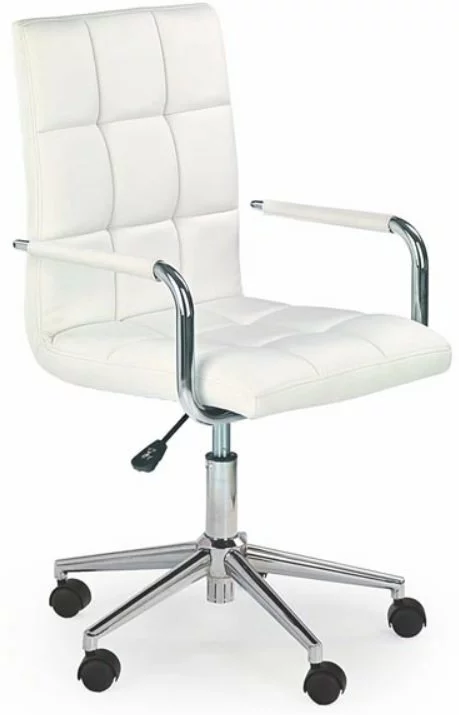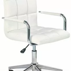 Ihana ja tyylikäs toimistotuoli. Valmistettu kromatusta metallista ja verhoiltu todella miellyttävällä valkoisella keinonahkalla. Istuimen korkeutta voi säätää ja tuolia on helppo siirtää jalkaristikon alla olevien pyörien ansiosta.