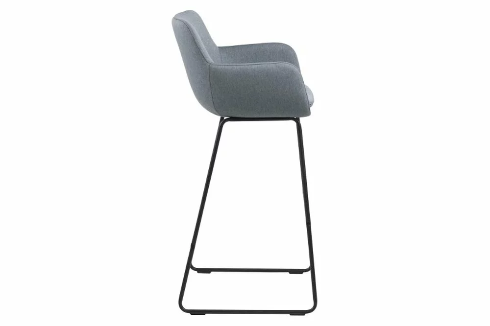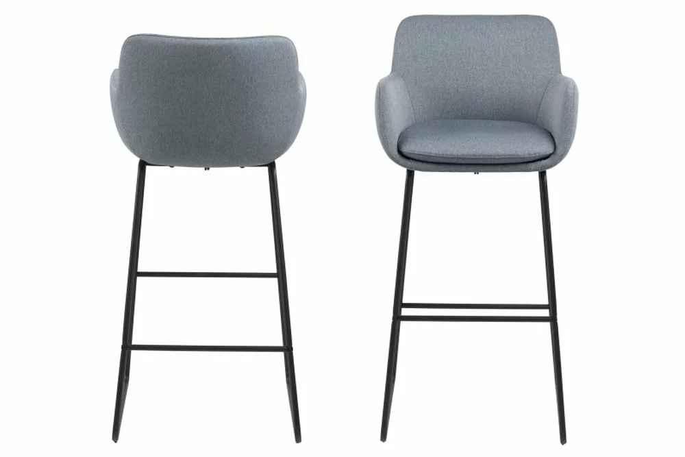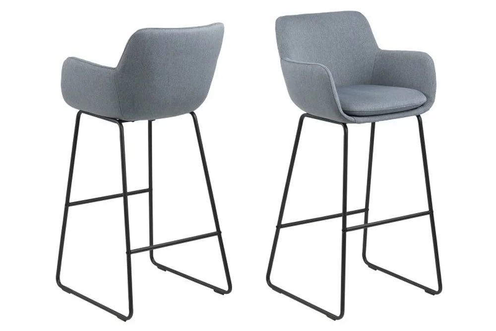 Mukava baarijakkara, päällystetty pölynsinisellä kankaalla ja metallijalat, jotka on maalattu mustaksi pulverimaalauksella.