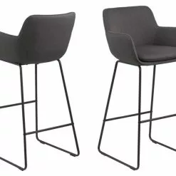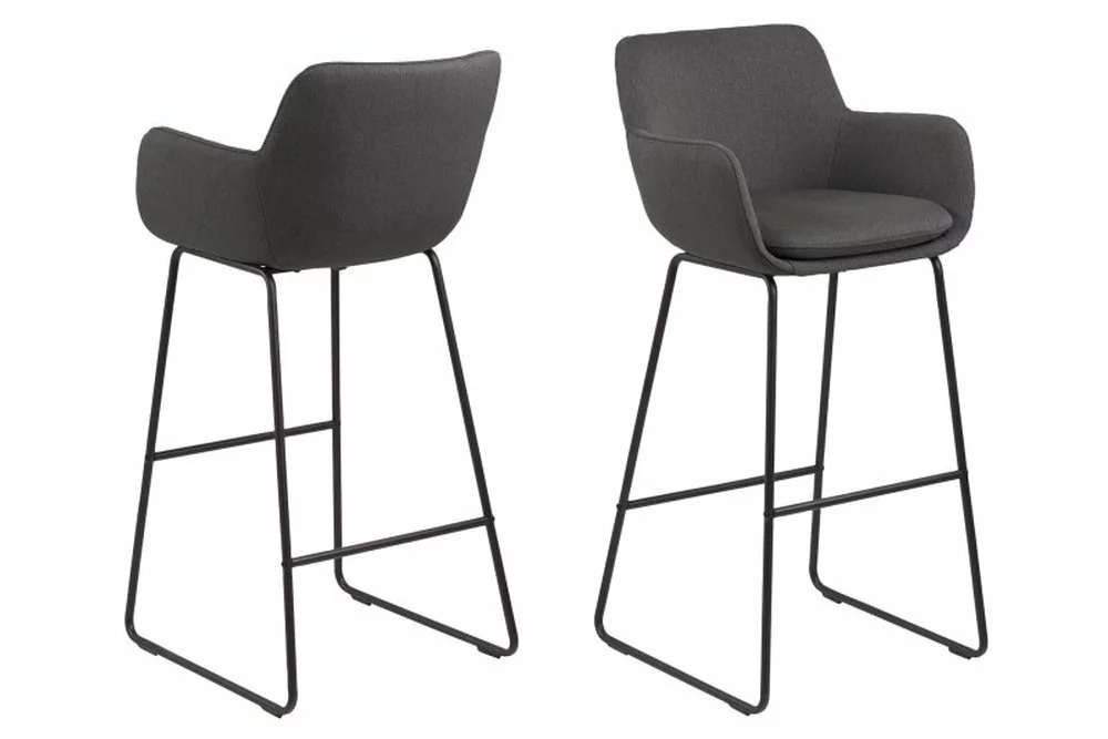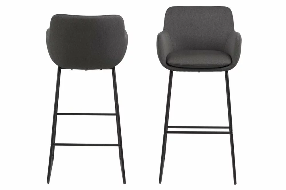 Mukava baarijakkara, päällystetty tummanharmaalla kankaalla ja metallijalat, jotka on maalattu mustaksi pulverimaalauksella.