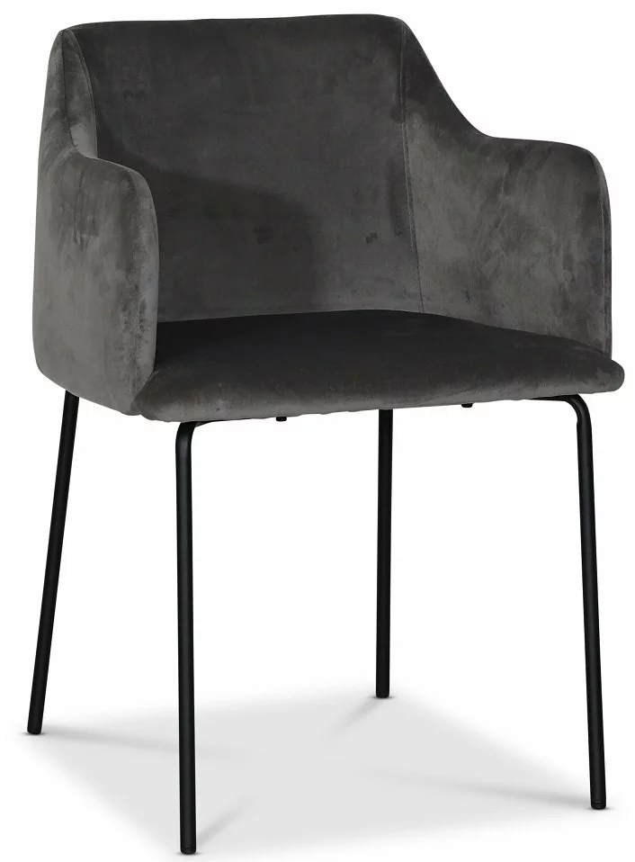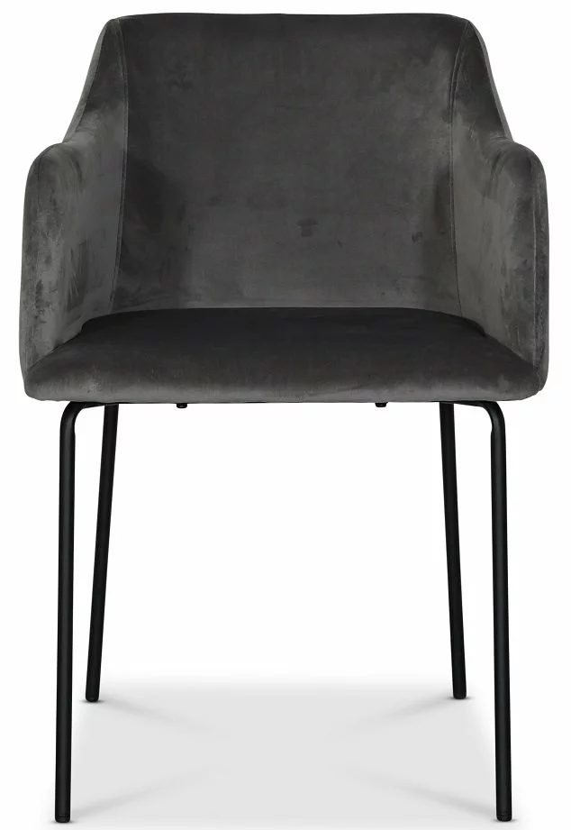 New Yorkin ohut nojatuoli, jossa mustat teräsjalat. Tummanharmaa pehmeä sametti. Täydellinen sekä moderneihin ruokapöytiin että klassisiin ruokapöytiin.