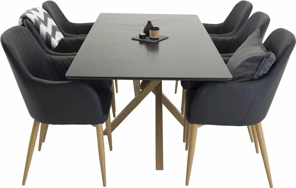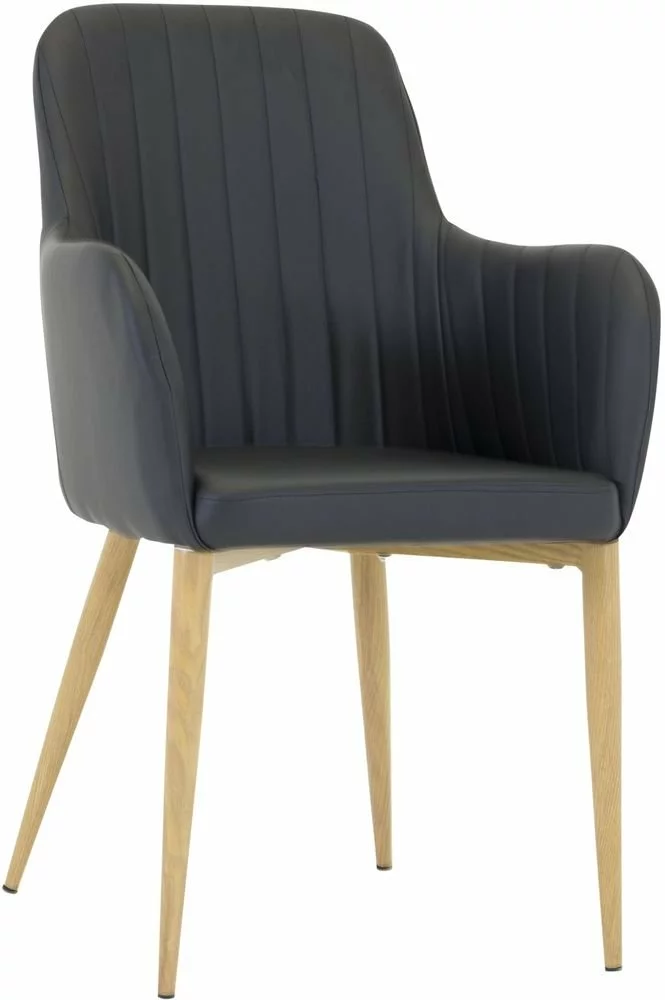 Mustalla PU:lla verhoiltu nojatuoli, 100 % polyesteriä. Tuoli on pehmustettu ja takaa hyvää istumamukavuutta. Runko on mustaa, tammikuvioista metallia.