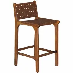 Porto Bello -baarituoli massiivista akaasiaa, tiikkiviimeistely. Istuin ja selkänoja satula konjakinruskeasta aniliininahasta. Tuoli kuuluu suosittuun sarjaamme Porto Bello.