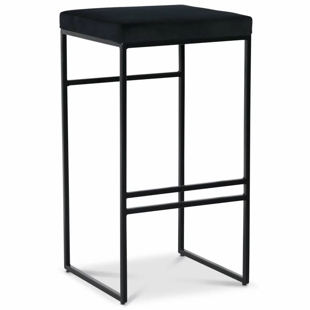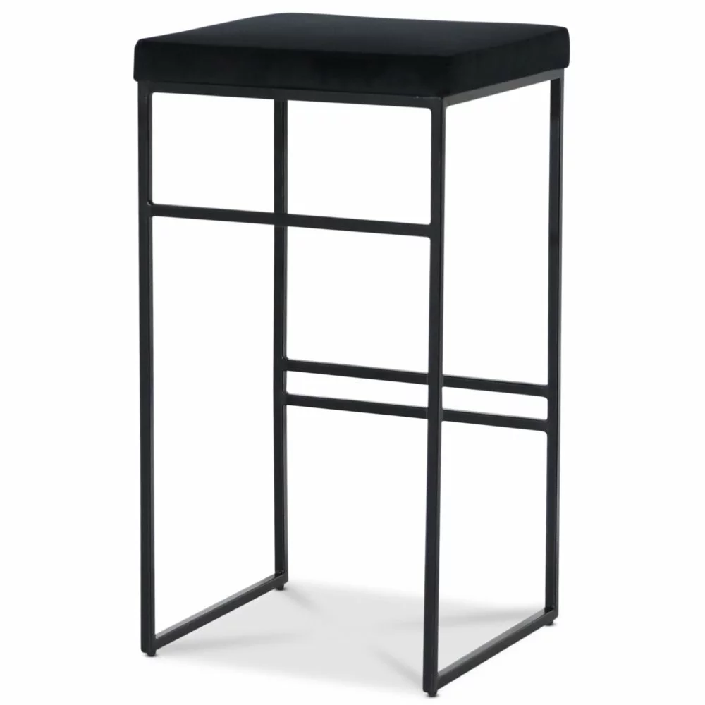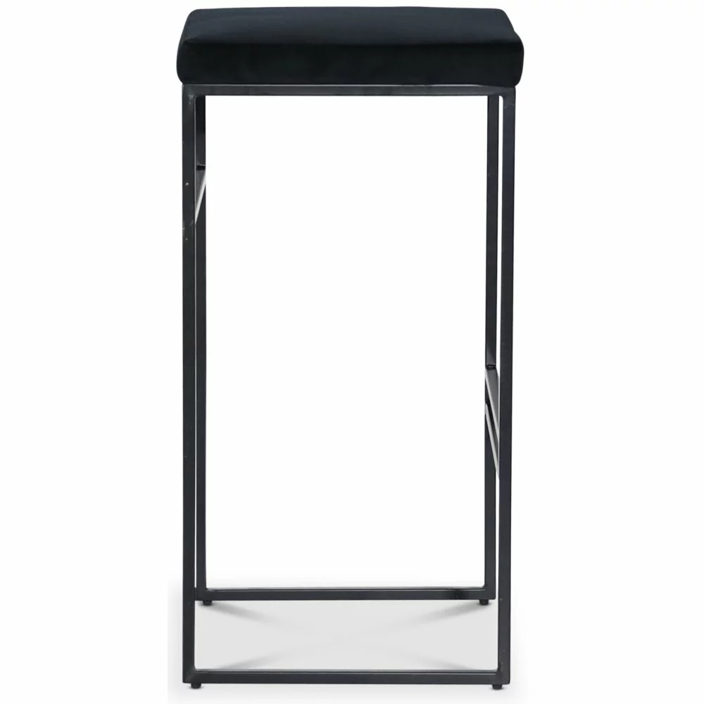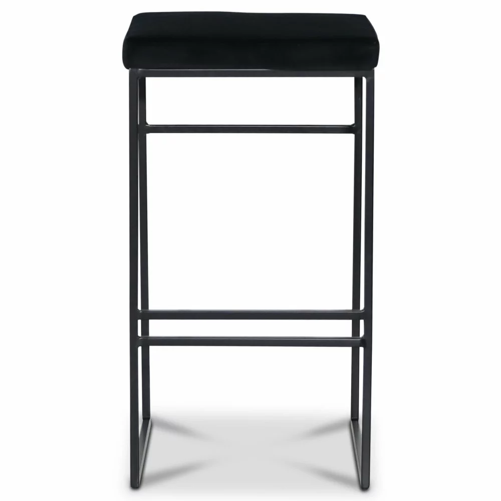 Tyylikäs ja moderni baarijakkara, jossa istuin ja tyyny mustaa samettia. Musta pulverimaalatut jalat.
