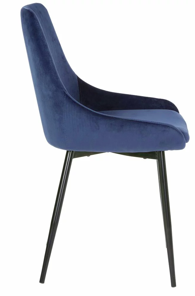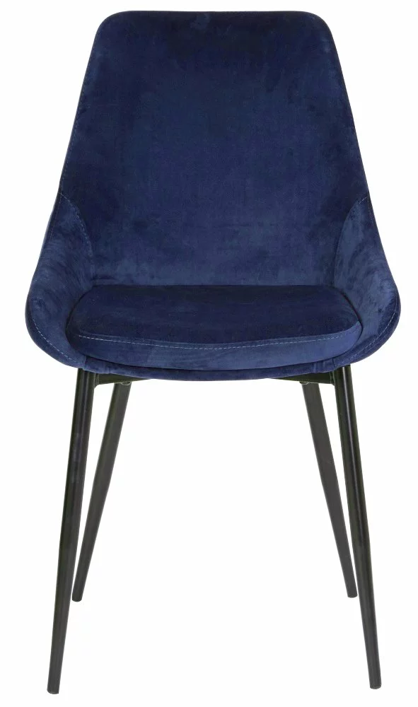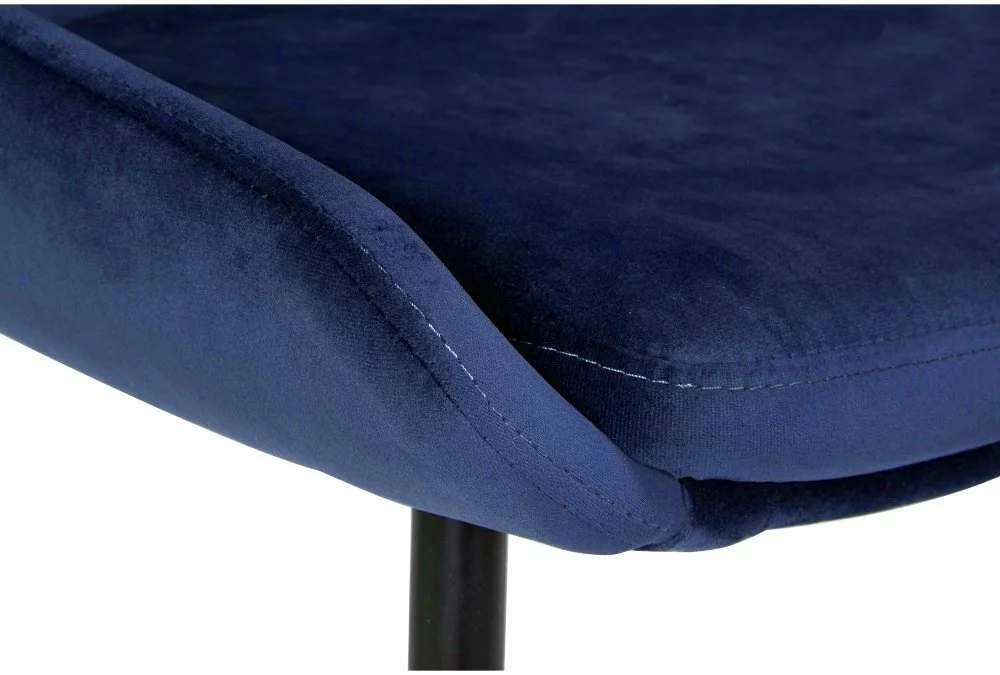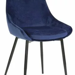 Theo-tuoli, jossa on mukavat istuimet ja tyylikäs muotoilu. Tuoliin kuuluu ylellinen verhoilu, nimittäin sininen samettikangas. Mustat teräsjalat.