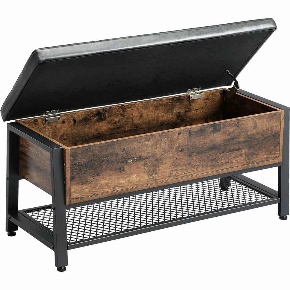 Puusta ja teräksestä valmistettu aulapenkki keinonahkaverhoilulla.