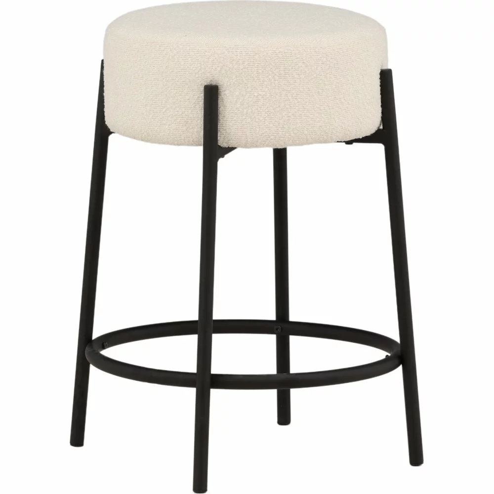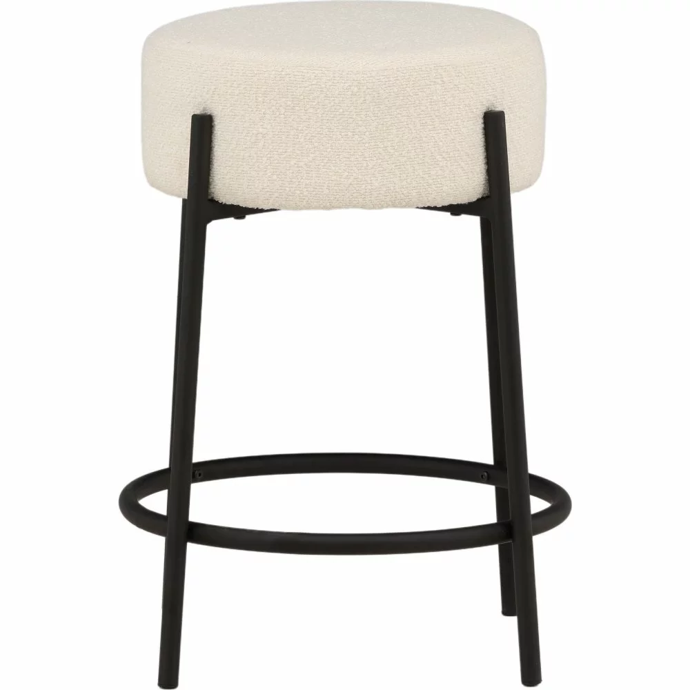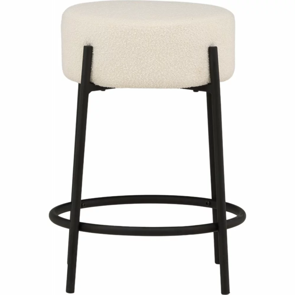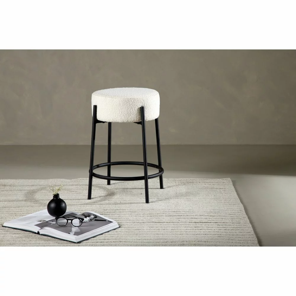Trendikäs muotoilu, jossa sylinterin muotoinen istuin valkoisesta boucle-kankaasta ja jalat mustasta teräksestä integroidulla jalkatuella. Tämä baarijakkara toimii yhtä hyvin keittiön baaritiskillä kuin pienemmän ruokapöydän ympärillä.