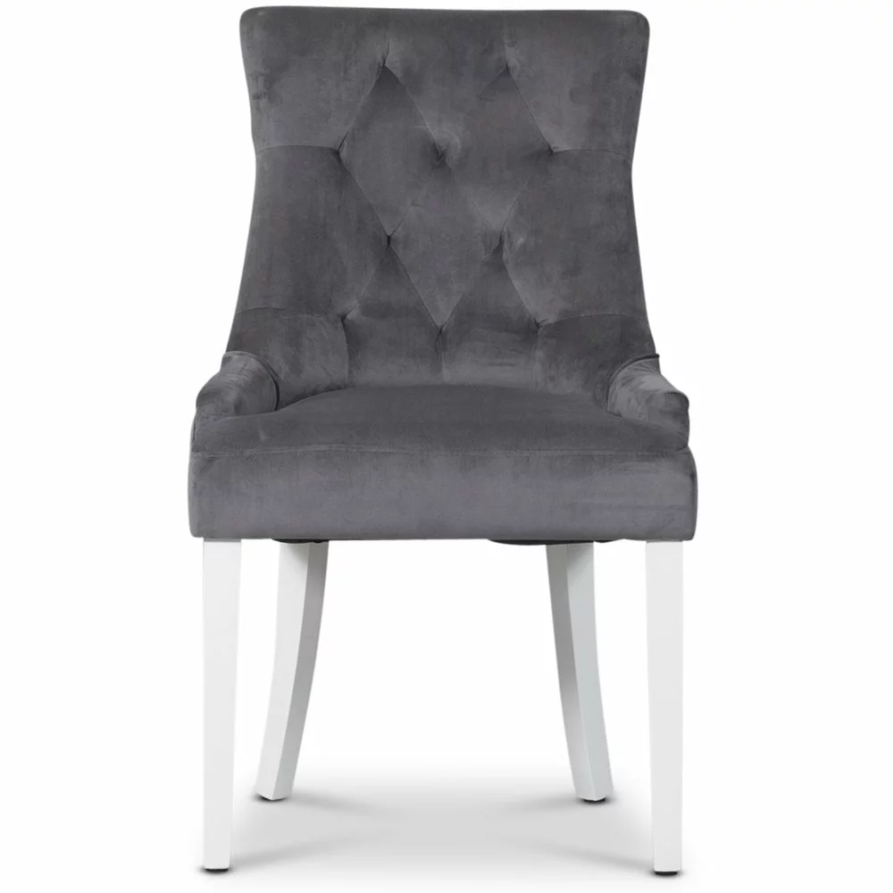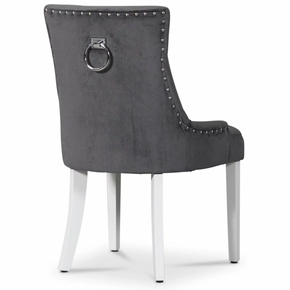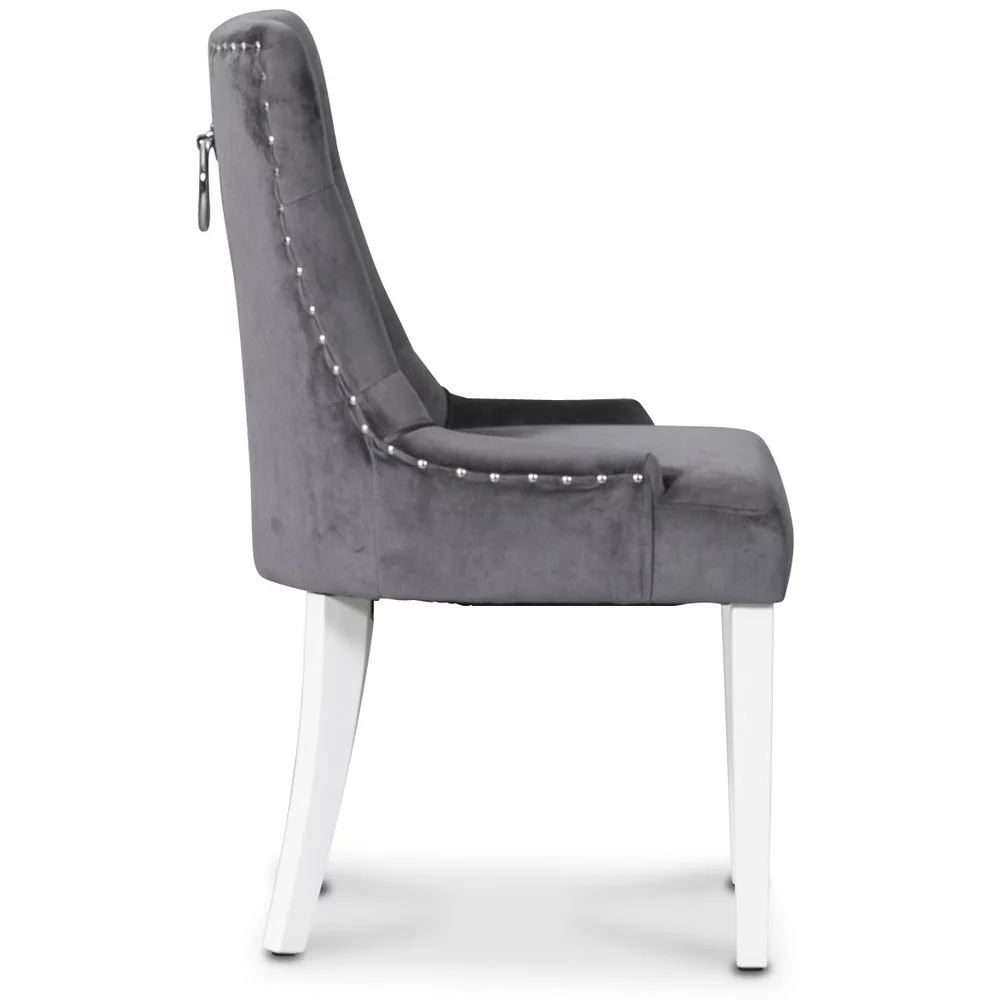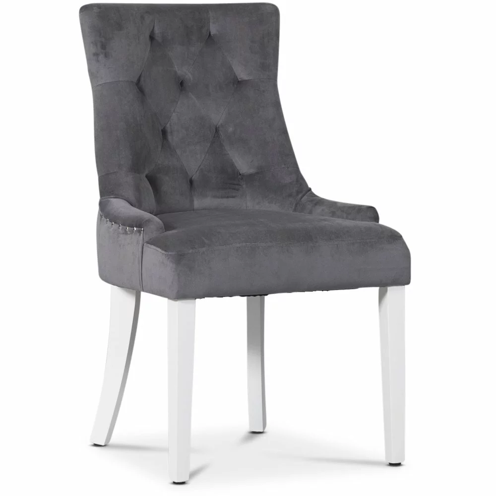 Tuva, harmaata samettia oleva ruokatuoli krominiiteillä ja rengaskahva takana. Ruokapöydän tuolissa on valkoiseksi lakatut puiset jalat. Stolen-sarja on yksi Trendrumin suosituimmista ruokapöydän tuoleista.