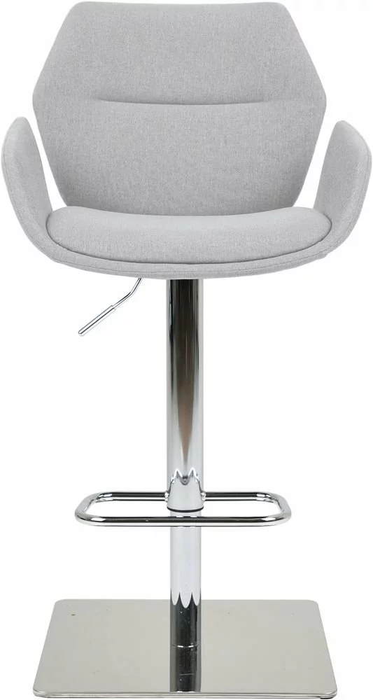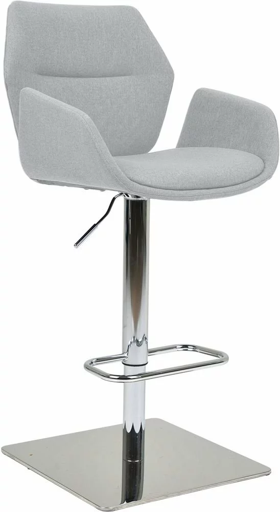 Baarijakkara harmaata kangasta, tukeva kromijalka ja jalkatuki. Moderni baarijakkara, joka toimii hyvin monissa ympäristöissä.